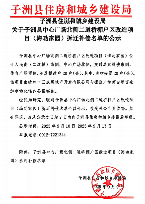 经我局研究,现对子洲县中心广场北侧二道桥棚户区改造项目(海功家园)拆迁补偿名单予以公示,接受社会各界监督。如有异议,请从公示之日起7日内向子洲县住房和城乡建设局举报。