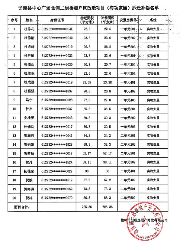 附件:子洲县中心广场北侧二道桥棚户区改造项目(海功家园)拆迁补偿名单